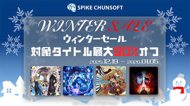 PC向けタイトルをお得な価格で販売する「ウィンターセール 2025」を、本日2025年12月19日(金)より18日間の期間限定で、Steamにて開催いたします。54タイトルを出品し、最大90%OFFの価格でご提供いたします。